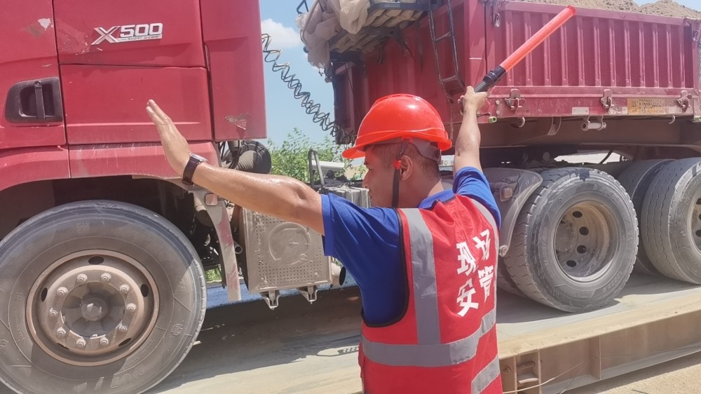 在地磅旁,一名員工手持鐵鍬,一遍又一遍的清理著地磅上的余砂,車(chē)輛來(lái)回穿梭,吹得臉上和身上遍是砂石,他沒(méi)有一句怨言,為了確保出場(chǎng)車(chē)輛稱重準(zhǔn)確性,默默堅(jiān)守著。