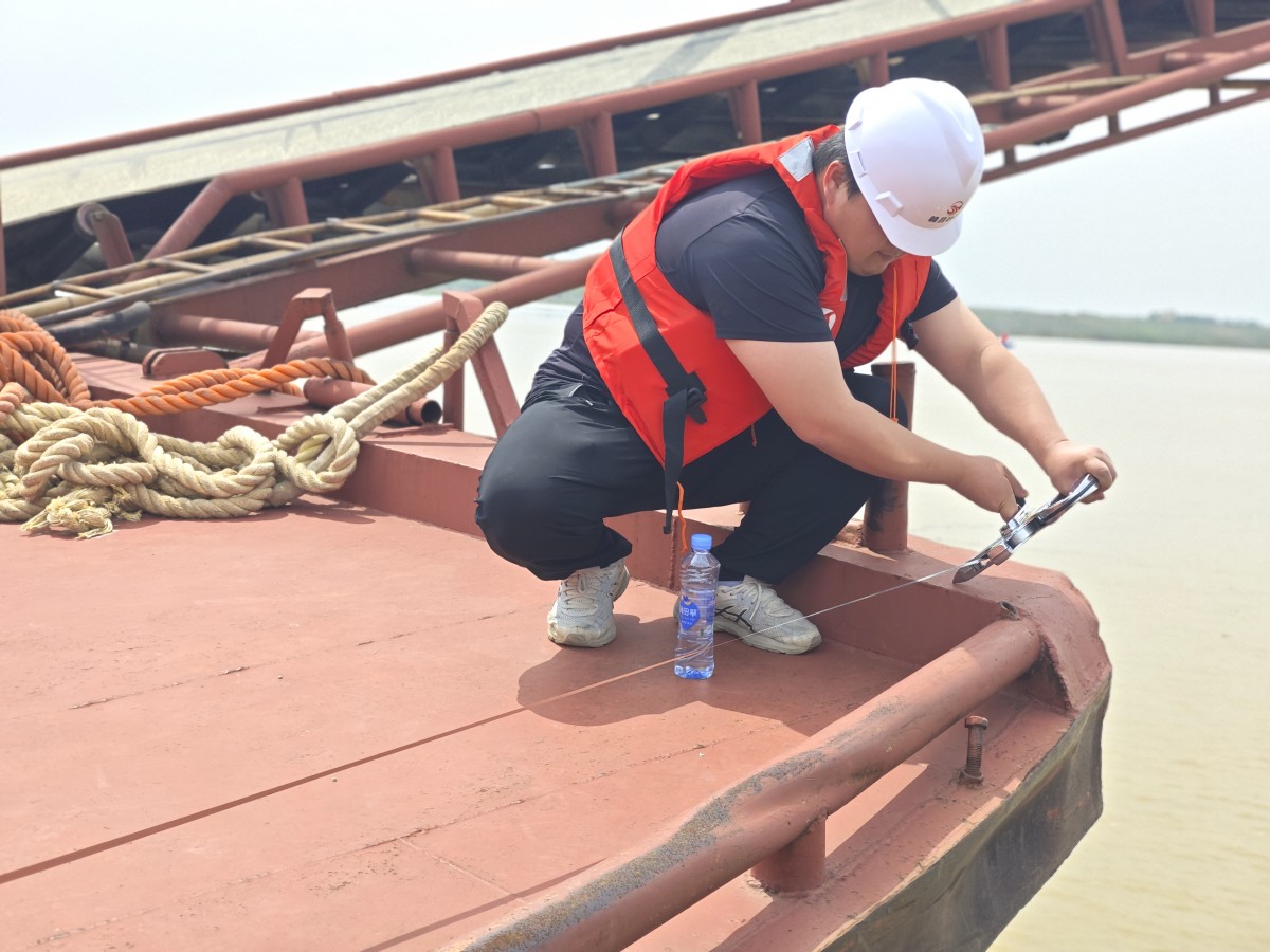 需要測(cè)量的運(yùn)輸船一般停在離堤岸100多米的江面上,量船人員必須先乘坐小船,靠近運(yùn)輸船船體后大家陸續(xù)通過懸掛在船沿上的鐵梯爬上距水面兩米多高的運(yùn)輸船,對(duì)一般人來說有著一定的難度。