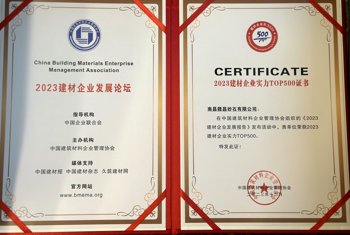 經(jīng)過各省、市、自治區(qū)建材協(xié)會、大型建材集團、各建材專業(yè)協(xié)會推薦、企業(yè)自薦和公開信息采集,按照入選標準進行深入調(diào)查、核查,并進行了全面、系統(tǒng)分析,南昌贛昌砂石有限公司榮獲“2023建材企業(yè)實力TOP500”和“2023建材企業(yè)管理TOP100”兩項行業(yè)大獎。