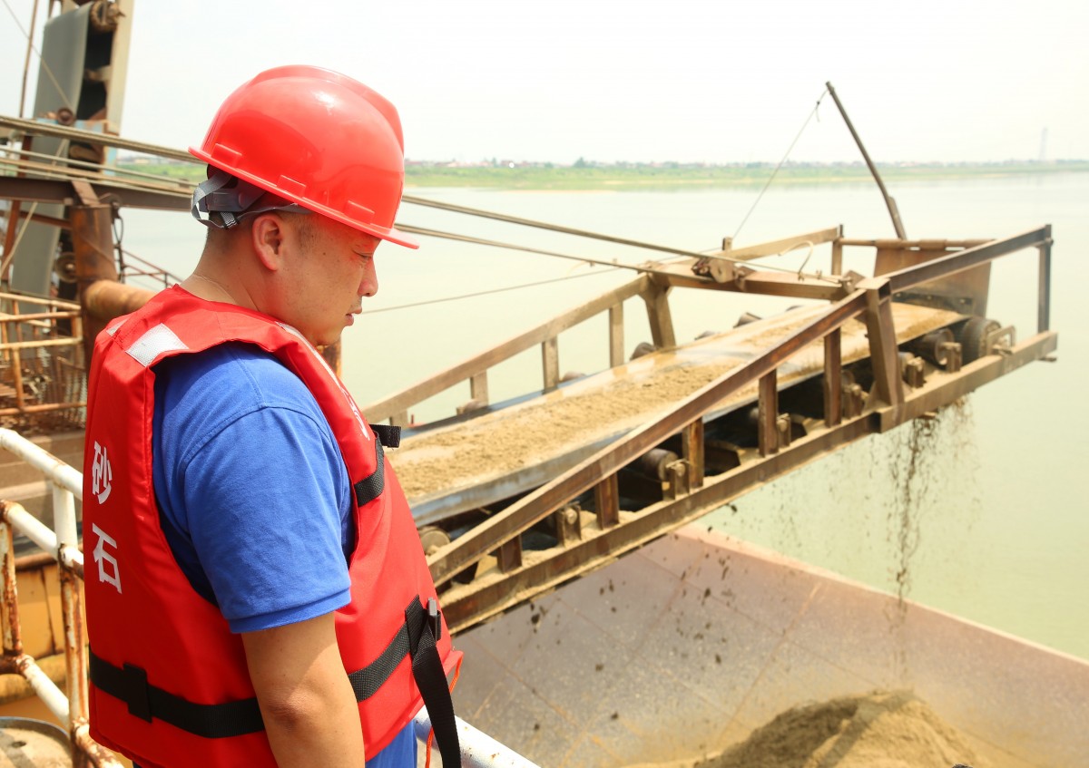 頭頂著烈日,贛昌砂石公司開采管理中心南贛4號(hào)采區(qū)班組的工作人員正在對(duì)砂石采挖情況進(jìn)行仔細(xì)的檢查。他們時(shí)刻關(guān)注設(shè)備的運(yùn)行情況。盡管水面蒸騰的熱氣和長(zhǎng)時(shí)間的暴曬使他們滿臉通紅,汗流浹背,但他們?nèi)匀痪ぞI(yè)業(yè)地工作。